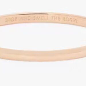 New with tags and dust bag, Kate Spade New York Stop and Smell the Roses Idiom Bangle in Rose Gold. Shiny plated metal hardware. Slides on with a diameter of 2.5" and width of 0.5" Classic and simple enough to wear on its' own or to stack along your other bracelets.