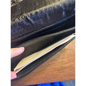 Design: Black Saffiano leather with a "Warm and Fuzzy Monster" design, including circular eye-like details on the flap closure.