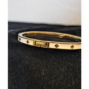 Kate Spade New York White Enamel Gold Tone Hinge Bangle Bracelet. White enamel with gold spades with a hinged open bangle. Measures 6.75. Pre-owned, this bangle is in excellent condition.