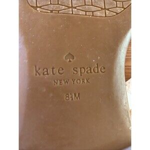 In good, preowned condition. The size is an 8.5M. The leather color is white. Very cute design with bow and Kate spade gold tone iconic charm. Some very light wrinkling of leather consistent with wear and some light tarnish or charm. Hard to detect. Also a blue spot at toe strap which is also hard to detect while wearing.