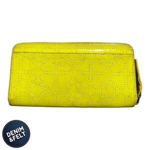 Fun patent leather bright yellow zip around wallet. This wallet does have some flaws so please see the pictures for those. The inside is in excellent condition.