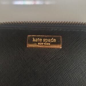 Kate Spade travel wallet has space for 6 cards, a zippered coin section and space for bills. Gently used. Zippers work great, no cracks or wear along the edges. The front Kate Spade plate is scratched and can be seen in pics. Clean inside and out.