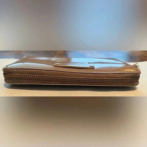 Women’s Kate Spade full zip around closure billfold. The back has a slide in pocket. The interior is lined, 9- credit card slots. 5- long, bill size, slide in pockets. 1- zippered closure coin section. Kate Spade logo tag on the front of the wallet. Very good, used condition. Designer wallet. Beautiful taupe patent leather.