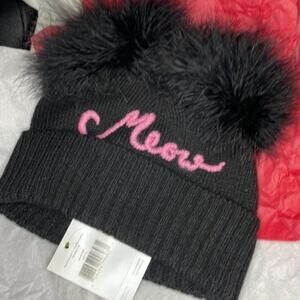 Marabou feather pompoms detail this 'Meow' stitched beanie for cozy winter style.
