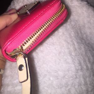 Kate spade New York mini credit card wallet. 3x4. I call it a red tone. My family says its pinkish. It's still super cute to grab and go, with whatever cards and small cash u need to take with u.