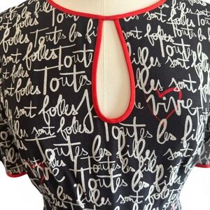 Additional Details: Chic and feminine 100% silk dress featuring an allover handwritten script print with contrast red trim. Keyhole neckline with button detail Back zipper closure Fully lined Elegant mid-length hem Lightweight and flowy silk fabric