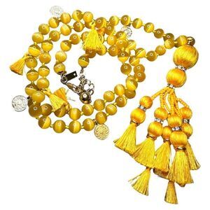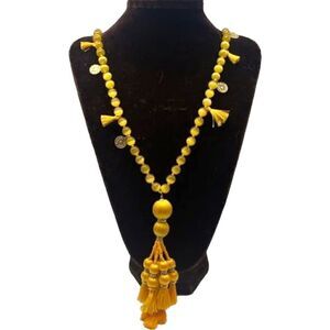 Crafted with luminous glass beads, luxurious silk tassels, and shimmering gold-plated details, this exquisite necklace is a rare and sold-out Kate Spade treasure. Its vibrant golden yellow hue adds warmth and vibrancy to any outfit, making it a must-have accessory for fashion lovers.