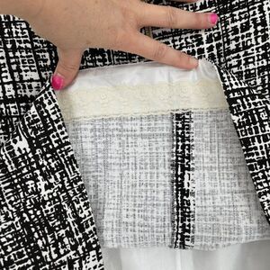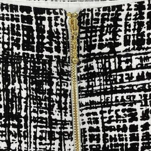 • A-Line silhouette. Above the knee. Gold tone exposed back zip closure. Belt loops. Fully lined. Crosshatched print in black & white. Shell: 100% Cotton; Lining: 100% Polyester. Style No: NJMU1767.