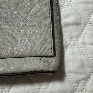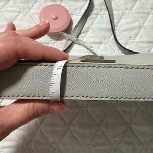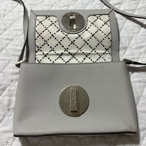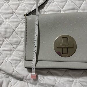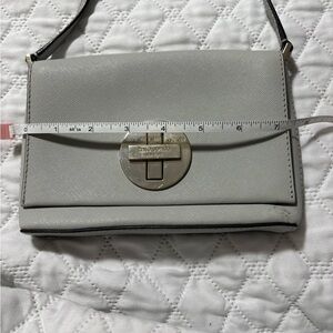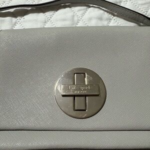 This Kate Spade crossbody bag in a sophisticated gray hue offers a sleek and minimalist design, perfect for any occasion. Crafted with a smooth leather-like finish, it features a prominent silver-toned hardware detail on the front. Its compact size and long strap make it an ideal choice for carrying essentials with style.