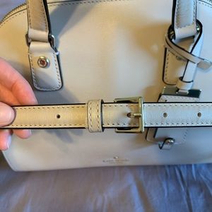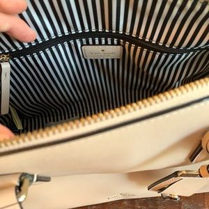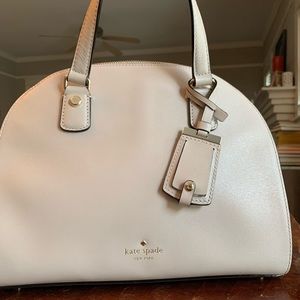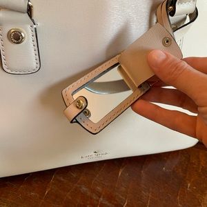 Kate Spade Nichols Street Riley in Rose Cloud. This is a beautiful bag. It is hard to capture the color, but it’s a lovely pale pink. It’s roomy inside with one zip pocket and two open slide pockets. 5” drop handles with detachable and adjustable 40” strap, so it can be used as a crossbody or over shoulder. 14k plated hardware, and a cute and convenient little mirror attachment. Only used 2-3 times, great condition! Approximately 9.2” H, 11.75” W, 6” D