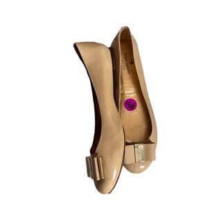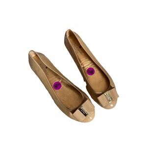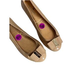 The Kate Spade Nude Ballet Flats in size 8.5 are stylish and elegant women's shoes. Featuring a delicate bow accent and gold hardware, these flats add a touch of sophistication to any outfit. Crafted from patent leather, these ballet flats are not only fashionable but also comfortable and versatile. The nude color and metal theme make them a timeless addition to any woman's shoe collection.