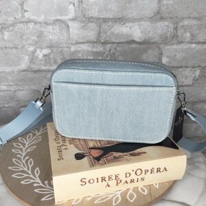 Kate Spade Oh Snap Denim Camera crossbody adjustable bag,purse. This is perfect for hands free shopping.🛍️ This is a charming,whimsical, preppy little bag. The denim is soft. ❤️ I was impressed with the quality of this bag. ♠️ This bag is now SOLD OUT at Kate Spade.