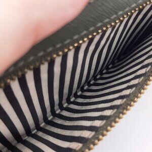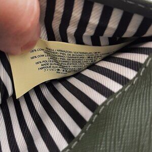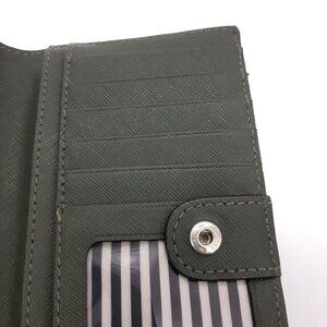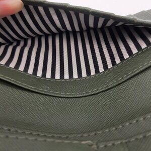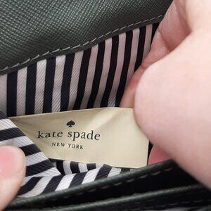 Kate Spade Olive Green & Gold Tone Leather Full Size Bifold Wallet. Textured Saffiano olive green leather with gold tone hardware. Signature black and white striped textile interior. Bifold with snap closure, exterior zip pocket, multiple interior pockets and lots of slots for cards and ID.