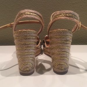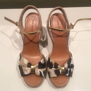 Super cute, barley worn, Kate Spade Open-toe Espadrille wedges. Espadrille bottoms with gold accent throughout. Open-toe style with black, brown and white. Like new, these have been worn 2-3 times, maximum. Super clean. Runs small, I normally wear 7.5 but these are 8.5.