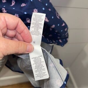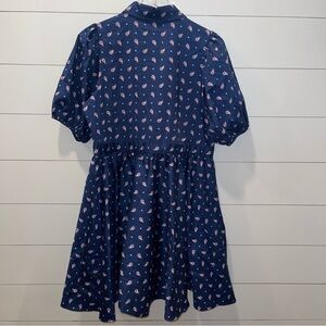 Stylish navy dress with pink floral design. Features puff sleeves and a classic collar.