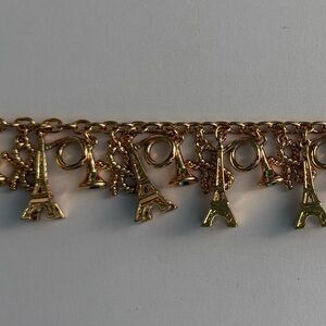 Fanciful charms loop a gilded, logoed bracelet for a playful nod to the City of Light.
