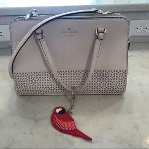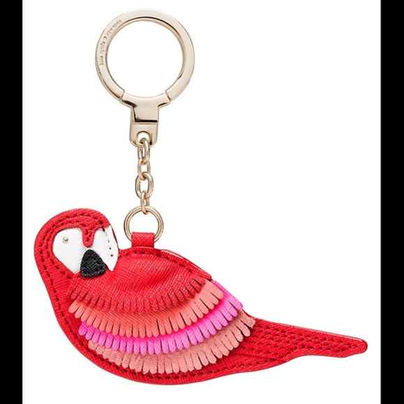Kate Spade parrot keychain with red, hot pink, light pink and peach colored feathers. It is so cute to put on purses to add extra styles!