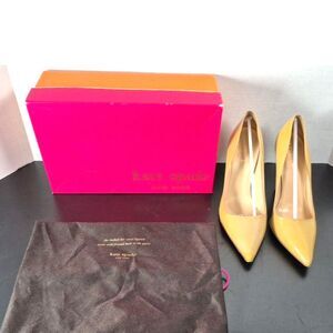 Kate Spade New York heels made in Italy. The heels are a light yellow patent leather with a pointed toe design and approximately 4-inch heel height. They come with their original box and dust bag. The shoes show minor signs of wear, particularly on the soles. Size 7.5