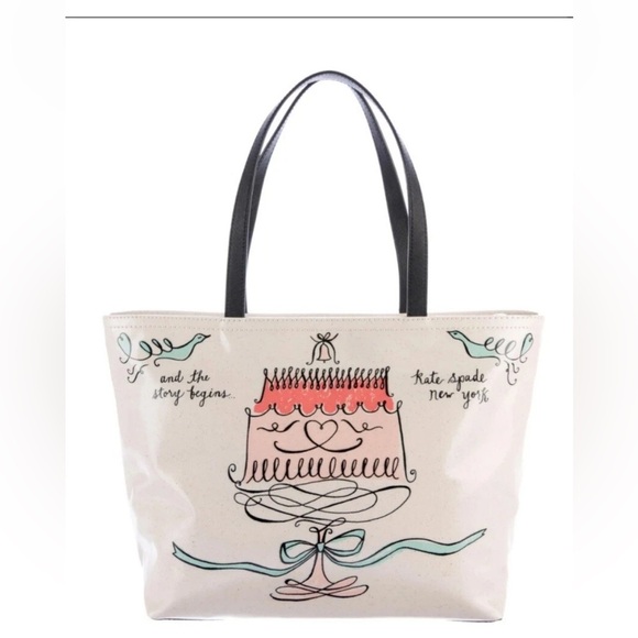 Kate Spade Wedding Bells (Cake) patent leather tote. Cream with pink and blue cake design. Pale blue logo lining. Like new except for two discolorations from storage. Seen in photos.
