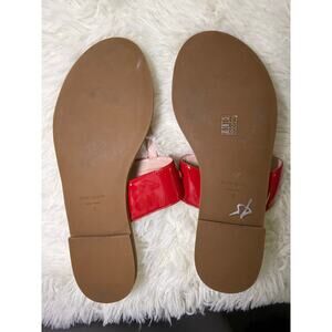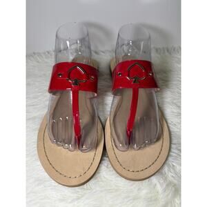 Step into effortless elegance with these Kate Spade New York patent red sandals. Featuring a glossy patent leather upper in a bold red hue, these sandals are both stylish and versatile. The signature Kate Spade heart and spade metal accent on the strap adds a touch of sophistication, making them perfect for both casual and dressy occasions.