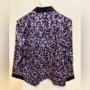 Stylish pajama top by Kate Spade. Features a vibrant multicolor pattern on a black base. Comfortable and chic design. Paired with some jeans or slacks this top can even be worn out. No flaws.