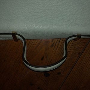 Pictures do not do this bag justice, it is beautiful! Made of soft pebbled leather in a springy mint color. The bag is lined with a light beige suede and is in excellent condition. It has gold accents and a removable strap. Measurements: 9" tall / 13" wide (at widest point) / adjustable strap 35" (at longest point).