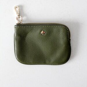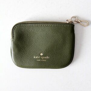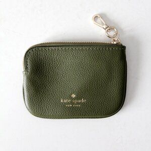 Chic Kate Spade coin pouch in olive green pebbled leather with gold-tone hardware and the signature kate spade new york logo. Features a top zipper closure and a clasp key ring—perfect for attaching to your bag or keys. Compact yet functional, it’s ideal for carrying coins, cards, or small essentials. A timeless, everyday accessory with Kate Spade’s signature polished charm.