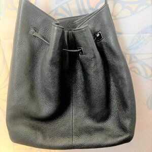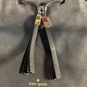 Kate Spade Pebbled Leather Drawstring Bucket Bag is in good used condition. There are some signs of wear on the bottom corners. The strap has been sewn back together. Please see all pictures for details. Inside is clean with no signs of wear. Outside has a few small wear marks.
