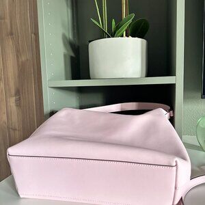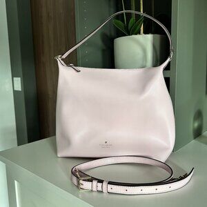Elegant and timeless, this Kate Spade New York pebbled leather shoulder bag adds effortless sophistication to any outfit. Crafted from soft blush pink leather with gold-tone hardware, this roomy hobo-style bag features a clean, minimalist silhouette. The interior includes both zip and slip pockets, making it ideal for everyday wear or travel. Includes detachable crossbody strap and original care booklet.