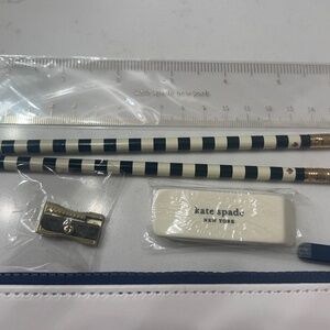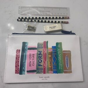 Super fun pencil pouch with book motif. It comes with two Kate Spade pencils, sharpener, eraser and ruler. New with tags and original wrapping.