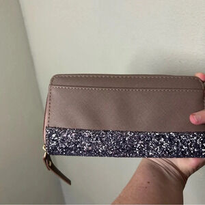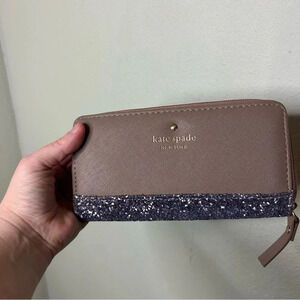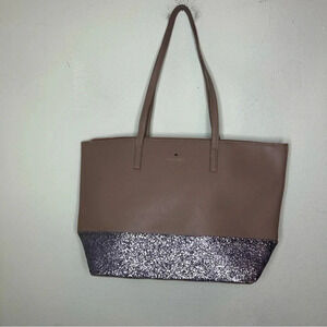 Beautiful Penny Great Court large purse from Kate Spade. Color is a taupe with purple glitter on the bottom. This purse has never been used, and it comes with a matching wallet and a matching credit card sleeve, both also unused. The bag measures 18" across at the top, and 12" top to bottom, excluding the handles. Fantastic 3 piece set and very pretty!