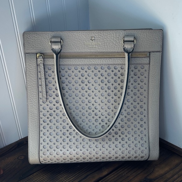 This Kate Spade Perri Lane Lynne Tote Bag is a stunning addition to any collection. The beige leather exterior is perforated for a unique look, and the gold-plated hardware adds a touch of elegance. The bag has double handles and a magnetic closure, making it easy to carry and access your belongings.