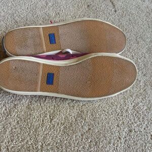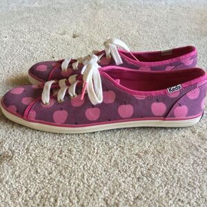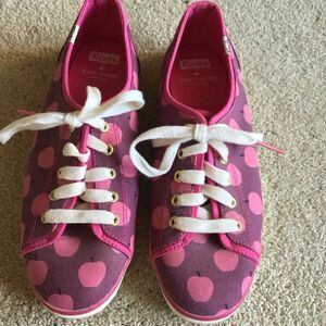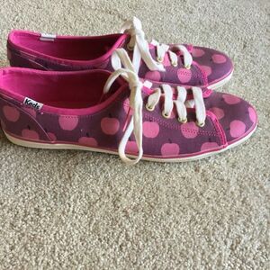 Chic sneakers with playful apple print. Vibrant pink design. Comfortable and stylish.