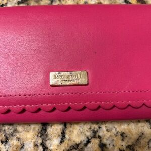 This chic Kate Spade wallet showcases a stunning pink leather finish with intricate braided detailing along the edges. Its sleek rectangular design and flap closure make it a stylish and practical accessory for organizing your essentials.