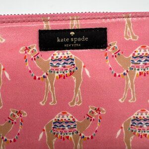 Playful and practical, this Kate Spade wallet features a whimsical camel print against a pink background with a metallic satin sheen. Designed with a full zip-around closure and gold-tone hardware, it opens to reveal multiple card slots, bill compartments, and a zippered coin pocket for easy organization. Perfectly sized to hold all your essentials while adding a pop of personality to your everyday style.