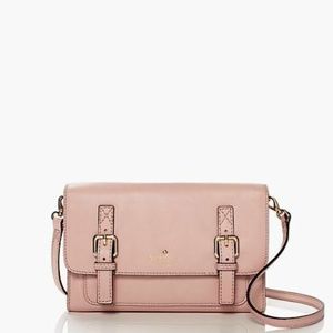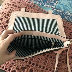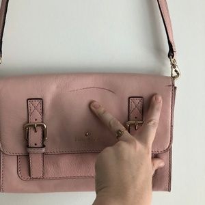 Elegant pink crossbody bag. Features buckle accents. Perfect for everyday use.