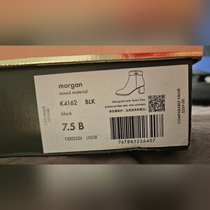 Includes unique product details and multilingual care instructions for the Kate Spade Morgan Boots (size 7.5 B).
