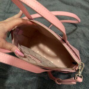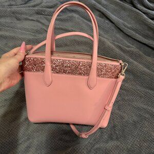 Add sparkle and style to your wardrobe with this authentic Kate Spade pink glitter handbag. Features include a signature glitter accent along the zipper, blush pink color, durable double handles, adjustable crossbody strap, and zipper closure. The bag is clean and gently used, perfect for both everyday use and special occasions.