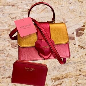 Kate Spade Pink Heart Metallic Color block MiniTop-Handle Crossbody Wallet set