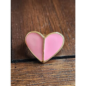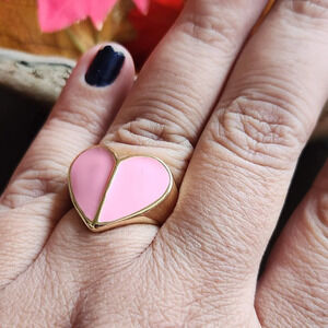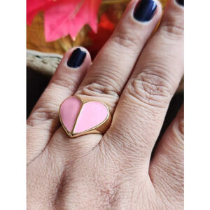 Charming heart-shaped ring. Features pink enamel. Gold-tone outline. Perfect for adding a playful touch.