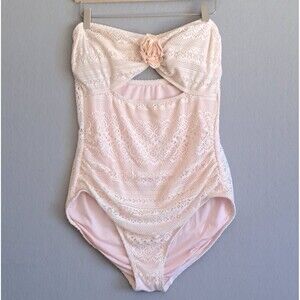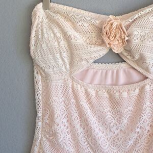 Elegant one-piece with lace detailing. Features a floral accent and cut-out design. Perfect for a stylish beach day.