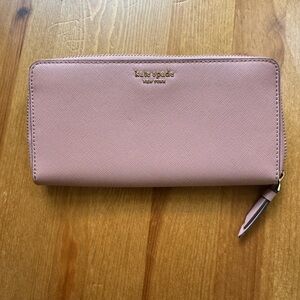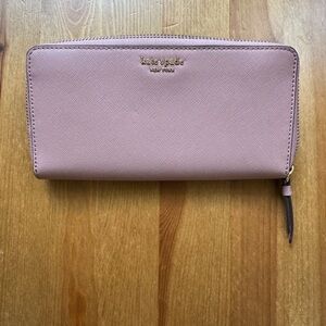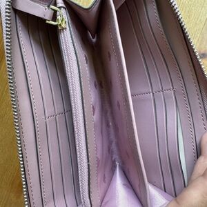 This Kate Spade wallet in a charming pink hue combines elegance with practicality. Its sleek design and high-quality leather material make it a timeless accessory for any occasion. The wallet's minimalist style is a testament to Kate Spade's commitment to sophisticated fashion.