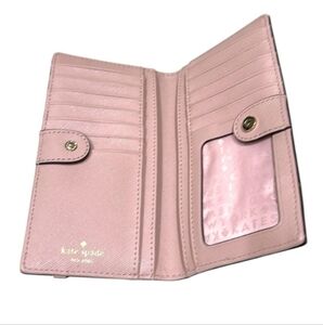 Chic and stylish, this Kate Spade wallet in pink features elegant bow detailing and stud accents. Perfect for adding a touch of sophistication to your everyday essentials.