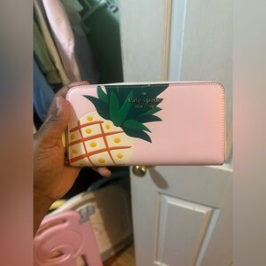 Chic pink wallet with a playful pineapple design. Features the Kate Spade logo.