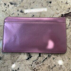 Elegant pink wristlet clutch. Shiny finish with gold logo detail. Perfect for any occasion.