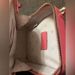 Chic pink shoulder bag by Kate Spade. Gold-tone zipper and logo. Elegant interior lining.