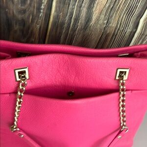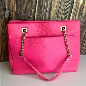 This vibrant pink tote from Kate Spade features a structured design with gold-tone chain details integrated into the straps. Its spacious interior and classic silhouette make it a standout accessory for any occasion.