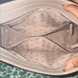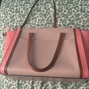Elegant tote with pink and cream panels. Brown handles add a classic touch.