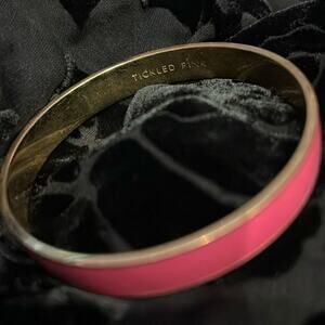 Super cute and preppy red and gold Kate Spade bangle with “TICKLED PINK” stamped inside! Perfect for the office, to dress up a nice outfit, etc. I don’t see any noticeable damage although I did wear and love her. I just don’t wear bangles much these days, and she deserves to be in a home where she’s loved! Wear alone or stack a few to make a statement!