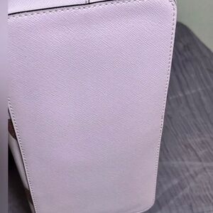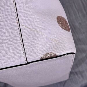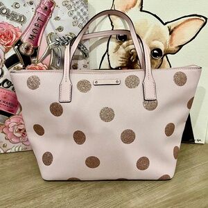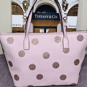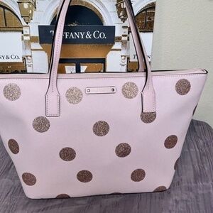 Chic pink tote with gold polka dots. Stylish and spacious. Perfect for everyday use.